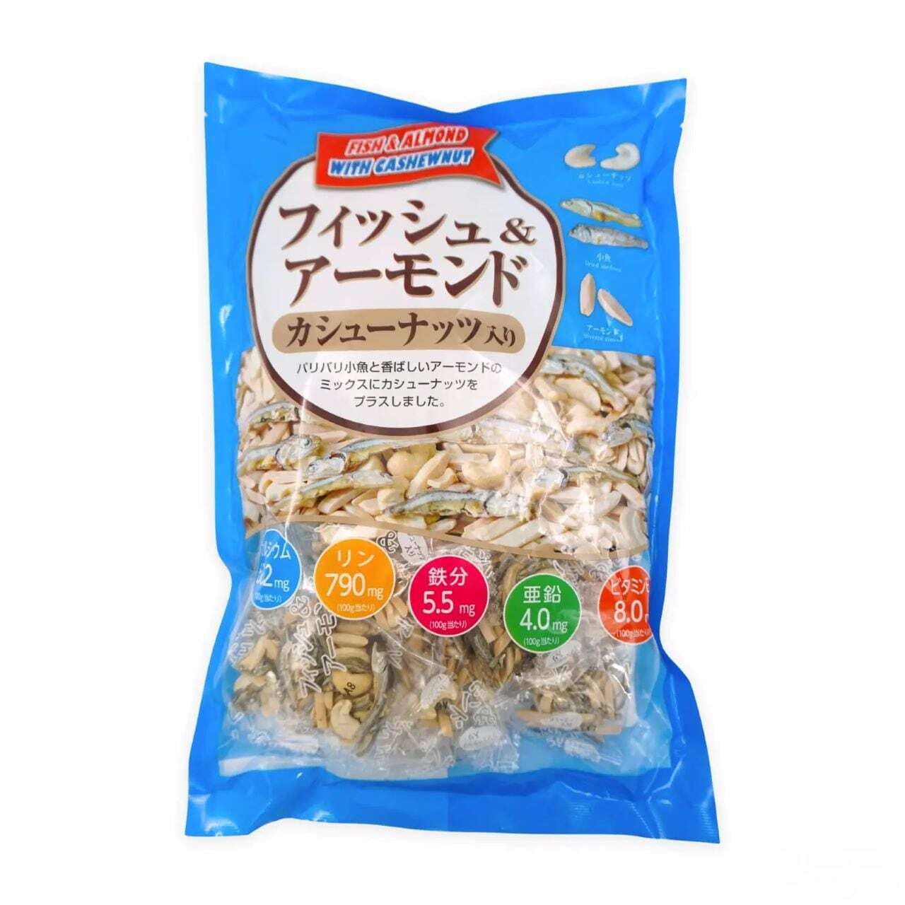 アーモンド・小魚(イワシ)・カシューナッツ入りでミネラルやビタミンなど栄養成分をしっかり含み、栄養価が高く、添加物も入っていないのでお子様のおやつにも安心して食べていただけます。