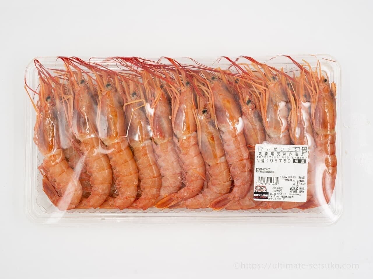 巨大な海老が頭から尻尾まで殻付きで入っているのが特徴な刺身用天然赤海老。