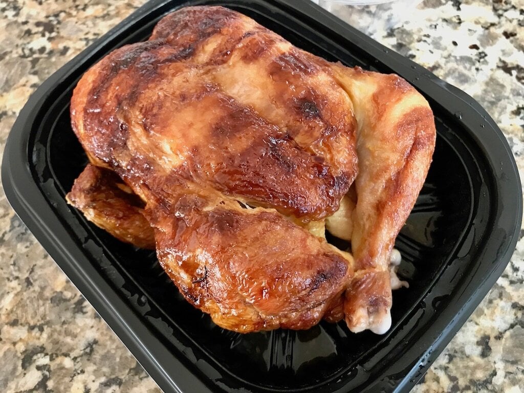 ローストされた鶏が一羽丸ごと楽しめる『ロティサリーチキン』です。コストコの商品の中でも特に人気の一品で、見た目もインパクトがありパーティーの主役にもぴったりです。